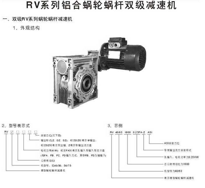 RV系列鋁合金蝸輪蝸桿雙級(jí)減速機(jī)雙級(jí)RV系列鋁合金蝸輪蝸桿減速機(jī)外觀結(jié)構(gòu)型號(hào)表示法